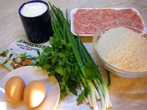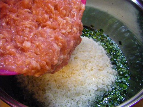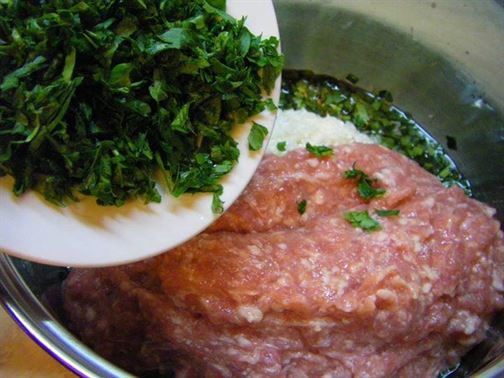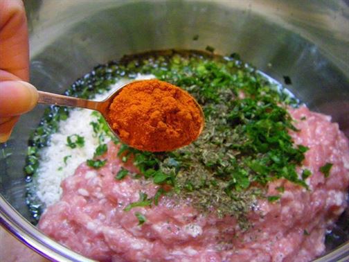 Към лука добавете каймата, ориза, червения пипер, нарязания магданоз, джоджена и сол на вкус. Разбъркайте добре, докато оризът стане леко прозрачен.
