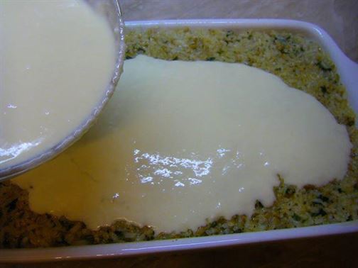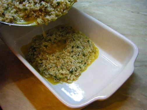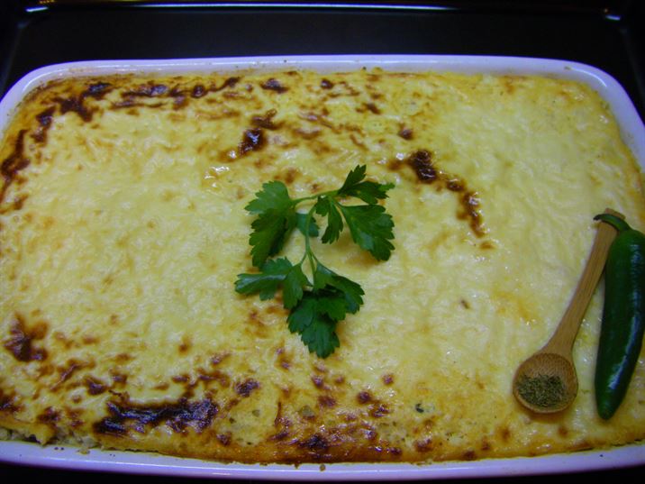 Изсипете сместа в подходяща тава и печете в умерена фурна на 180°C, докато ястието остане на мазнина.