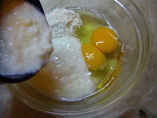 Разбийте яйцата заедно с киселото мляко и брашното, докато получите гладка смес.