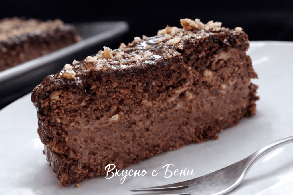 Заливката за този сладкиш е от разтопен черен шоколад върху който поръсих със смлени орехи.