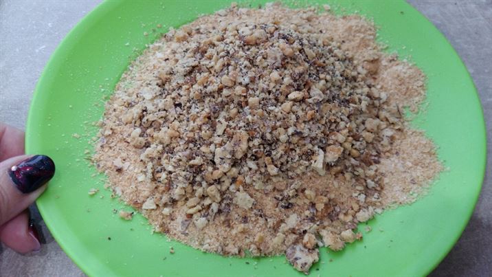 В плитка чиния се смесват ореховите ядки с галетата.