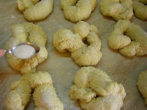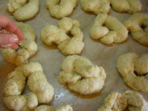 РАЗТВОРЕТЕ МАЯТА В 500 МЛ ХЛАДКА ВОДА,ПРИБАВЕТЕ ЕДНА ЧАЕНА ЧАША БРАШНО И ОСТАВЕТЕ ДА УДВОИ ОБЕМА СИ ЗА ОКОЛО 30-40 МИНУТИ.ЗАМЕСЕТЕ ТЕСТО ОТ ОСТАНАЛОТО БРАШНО,ВТАСАЛАТА МАЯ,СОЛ И ОСТАВЕТЕ ОТНОВО ДА ВТАСА НА ТОПЛО ЗА 20-25 МИНУТИ.РАЗДЕЛЕТЕ ТЕСТОТО НА ТОПКИ,КАТО ВСЯКА ТОПКА ТРЯБВА ДА ТЕЖИ ОКОЛО 100 ГР.РАЗТЕГЛЕТЕ ВСЯКА НА ФИТИЛ С ДЪЛЖИНА ОКОЛО 40 СМ,УСУЧЕТЕ,СЛЕПЕТЕ КРАИЩАТА,ЗА ДА СЕ ПОЛУЧИ ГЕВРЕК (КАКТО МОЖЕ ДА ВИДИТЕ ОТ СНИМКИТЕ "СТЪПКА ПО СТЪПКА").НАРЕДЕТЕ ГИ НА НАБРАШНЕНА ПОВЪРХНОСТ, ПОРЪСЕТЕ ГИ С БРАШНО И ОСТАВЕТЕ ЗА 15 МИНУТИ ДА ВТАСАТ ОТНОВО.В ПОДХОДЯЩА ТЕНДЖЕРА ИЗСИПЕТЕ ГЛЮКОЗАТА,ДОБАВЕТЕ 750 МЛ ВОДА,КИПНЕТЕ И ЗАПОЧНЕТЕ ДА ПОТАПЯТЕ ВСЕКИ ГЕВРЕК ВЪВ ВРЯЩИЯ СИРОП ЗА ОКОЛО ЕДНА,ДВЕ МИНУТИ.ИЗВАДЕТЕ ГИ,НАРЪСЕТЕ ГИ ОБИЛНО СЪС СУСАМ И КРИСТАЛНА ЗАХАР.СЛЕД КАТО ЗАСЪХНАТ,ГИ НАРЕДЕТЕ В ЗАСТЛАНА С ХАРТИЯ ЗА ПЕЧЕНЕ ТАВА. ПЕЧЕТЕ ГИ В ПРЕДВАРИТЕЛНО ЗАГРЯТА НА 180-200 ГРАДУСА ФУРНА ДО ЗЛАТИСТ ЦВЯТ. СТАВАТ МНОГО ВКУСНИ. ПРОБВАЙТЕ И СПОДЕЛЕТЕ. ДА ВИ Е СЛАДКО.