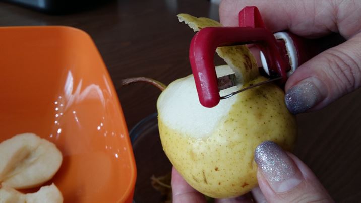Крушите ги белим и почистваме от семките. Нарязваме на парченца .