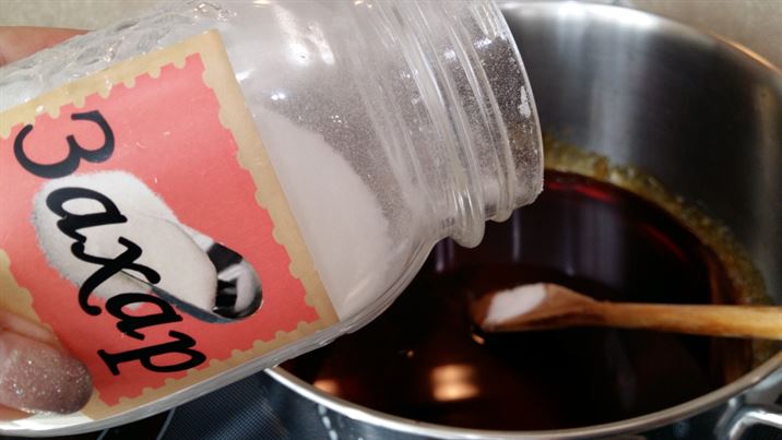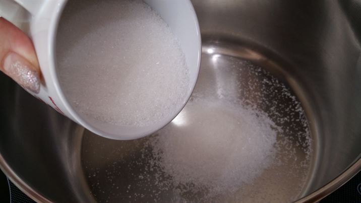 От захарта в подходяща тенджера която ще варим сладкото изсипваме само една чаена чаша.