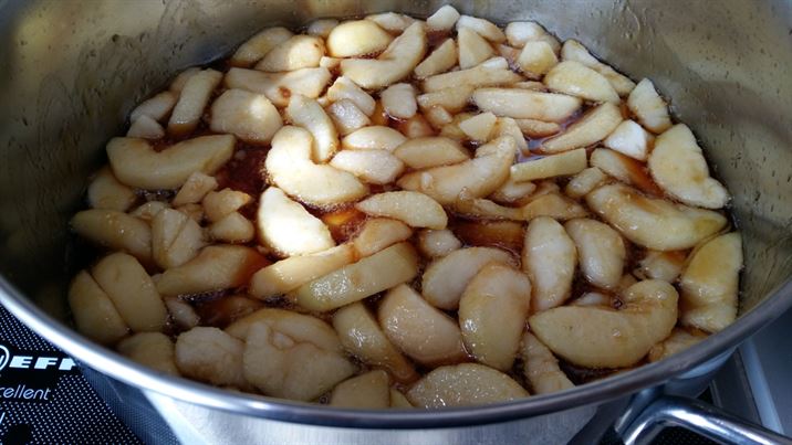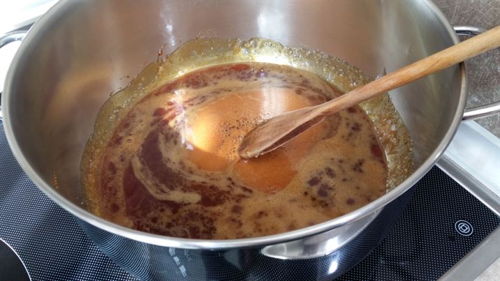 Слагаме на котлона до получаване на кехлибарен карамел.