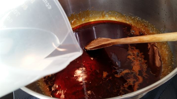 Когато е готов, добавяме внимателно водата. Разбъркваме до пълното стопяване на карамела