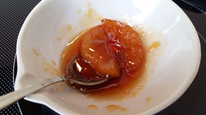 Когато сиропа се сгъсти , пуснете внимателно крушите в него.