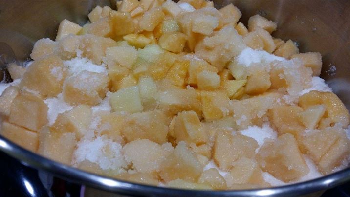 Поръсва се равномерно нарязания пъпеш със захарта. Оставя се 3-4 ч. да престои в подходящ съд на хладно.