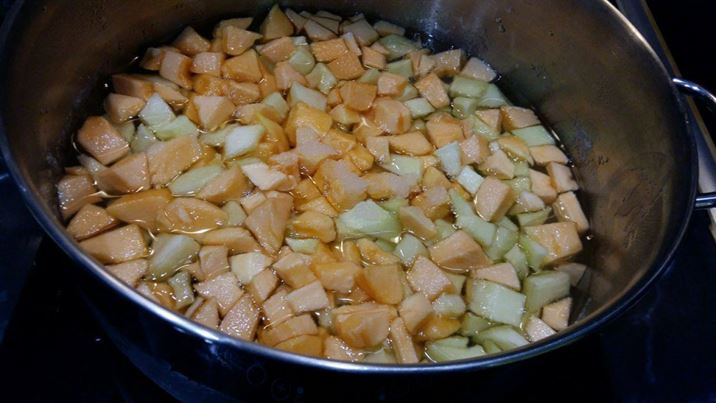 След това задължително към отделения сок който е отпуснат от пъпеша, се прибавя 200 мл вода и след това се вари.
