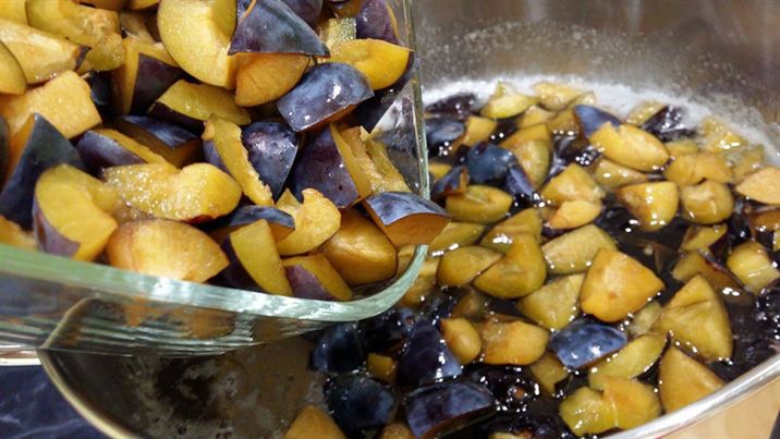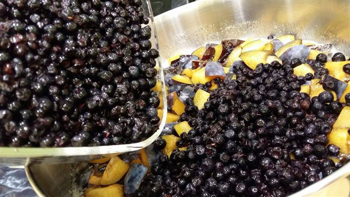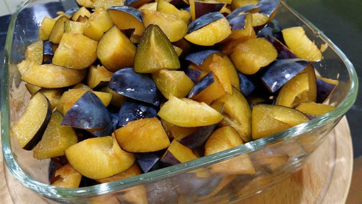 Измивате добре боровинките и сливите, почиствате сливите от костилките, като ги разделите на две половини, а после на четири.