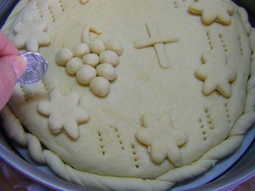 В ДЪЛБОК СЪД ПРЕСЕЙТЕ БРАШНОТО И НАПРАВЕТЕ КЛАДЕНЧЕ. ПОГАСЕТЕ В ОЦЕТА СОДАТА БИКАРБОНАТ. ИЗСИПЕТЕ В КЛАДЕНЧЕТО ЗАХАРТА, СОЛТА, ПОГАСЕНАТА СОДА БИКАРБОНАТ, БАКПУЛВЕРА, ОЛИОТО И ПОСТЕПЕННО ДОБАВЯЙТЕ ХЛАДКАТА ВОДА И ЗАМЕСЕТЕ ТЕСТО. ОСТАВЕТЕ ДА ПОЧИНЕ 15 МИНУТИ. ЗАСТЕЛЕТЕ С ХАРТИЯ ЗА ПЕЧЕНЕ ТАВА С ГОЛЕМИНА 26 СМ И НАМАЖЕТЕ С МАЛКО МАЗНИНА. ОТКЪСНЕТЕ МАЛКА ЧАСТ ОТ ТЕСТОТО ЗА УКРАСА, ДРУГОТО ГО ОФОРМЕТЕ НА КРЪГ С ПОМОЩТА НА ТОЧИЛКА. С ОТДЕЛЕНАТА ЧАСТ НАПРАВЕТЕ РАЗЛИЧНИ ЕЛЕМЕНТИ , КАТО ЦВЕТЕНЦА, ГРОЗДЕ, КРЪСТ И Т.Н. ПОДРЕДЕТЕ ГИ ВЪРХУ ПИТКАТА (КАКТО МОЖЕ ДА ВИДИТЕ ОТ СНИМКИТЕ "СТЪПКА ПО СТЪПКА"), СЛОЖЕТЕ ПАРИЧКАТА УВИТА ВЪВ ФОЛИО.НАБОДЕТЕ ПИТКАТА НА НЯКОЛКО МЕСТА С ВИЛИЦА, ЗА ДА НЕ СЕ ПУКА ПРИ ПЕЧЕНЕ.НАМАЖЕТЕ ПИТКАТА С ОЛИО И ПОЖЕЛАНИЕ ПОРЪСЕТЕ СЪС СУСАМ. ПЕЧЕТЕ НА 180 ГРАДУСА ДО ЗЛАТИСТ ЦВЯТ. ВЕДНАГА СЛЕД КАТО ИЗВАДИТЕ ПИТКАТА ОТ ФУРНАТА Я НАПРЪСКАЙТЕ С ВОДА, ЗАВИЙТЕ Я С КЪРПА И Я ОСТАВЕТЕ ЗА 5-10 МИНУТИ. ПРОБВАЙТЕ И СПОДЕЛЕТЕ. ДА ВИ Е СЛАДКО.