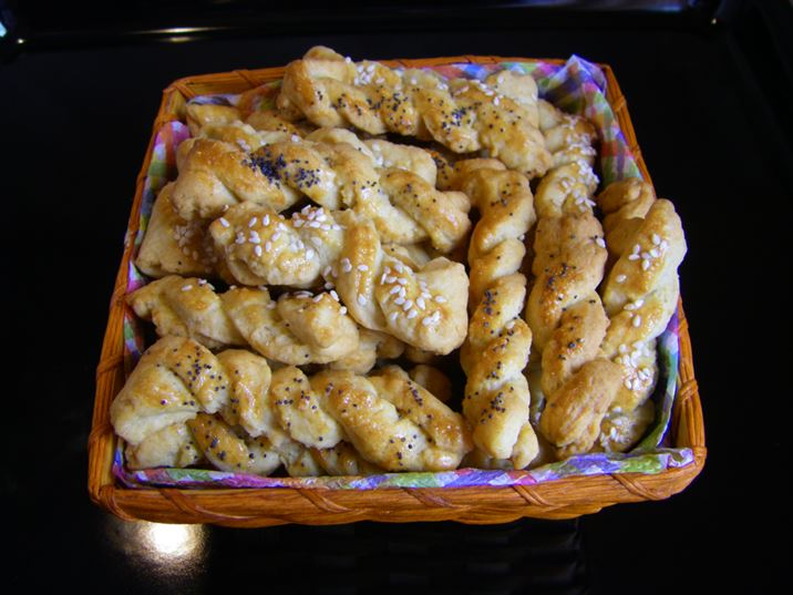 400 ГР БРАШНО,1 БАКПУЛВЕР,1 ЧАЕНА ЛЪЖИЦА СОЛ,1/2 ЧАЕНА ЛЪЖИЦА ЧУБРИЦА,200 ГР МАРГАРИН,2 ПАКЕТЧЕТА СИРЕНЕ "КРЕМА",1 ЯЙЦЕ,1 СУПЕНА ЛЪЖИЦА ПРЯСНО МЛЯКО,СУСАМ ,МАК. БРАШНОТО СЕ ПРЕСЯВА С БАКПУЛВЕРА,СОЛТА И ЧУБРИЦАТА.ПРИБАВЯТ МАРГАРИНА,СИРЕНЕТО,ПРЯСНОТО МЛЯКО (КАКТО МОЖЕ ДА ВИДИТЕ ОТ СНИМКИТЕ "СТЪПКА ПО СТЪПКА") .СМЕСТА СЕ СТРИВА С РЪКА ДА СТАНЕ НА ТЕСТЕНА ТОПКА.ТЕСТОТО СЕ МЕСИ 3-4 МИНУТИ.РАЗДЕЛЯ СЕ НА ТРИ ТОПЧЕТА,КОИТО СЕ РАЗТОЧВАТ НА КОРА НЕ МНОГО ТЪНКА.РАЗРЯЗВАТ СЕ НА ЛЕНТИ.ВСЯКА ЛЕНТИЧКА СЕ РАЗРЯЗВА ОТ ГОРЕ ,НО С 1 СМ НАВЪТРЕ,А НЕ ОТ САМОТО НАЧАЛО ТАКА ,ЧЕ ДА ОСТАНАТ СВЪРЗАНИ И СЕ ОПЛИТАТ ИЛИ СЕ УСУКВАТ ПО РАЗЛИЧНИ НАЧИНИ ПО ВАШЕ ЖЕЛАНИЕ.НАМАЗВАТ СЕ С РАЗБИТО ЯЙЦЕ И СЕ ПОРЪСВАТ ЕДНА ЧАСТ С МАК,ДРУГАТА ЧАСТ СЪС СУСАМ.ПЕКАТ СЕ В НЕ НАМАЗАНА ТАВА ИЛИ ТАВА ЗАСТЛАНА С ХАРТИЯ ДО ПОРОЗОВЯВАНЕ В ПРЕДВАРИТЕЛНО ЗАГРЯТА НА 180-200 ГРАДУСА ФУРНА. СТАВАТ МНОГО ВКУСНИ И КРЕХКИ. ПРОБВАЙТЕ И СПОДЕЛЕТЕ. ДА ВИ Е СЛАДКО.