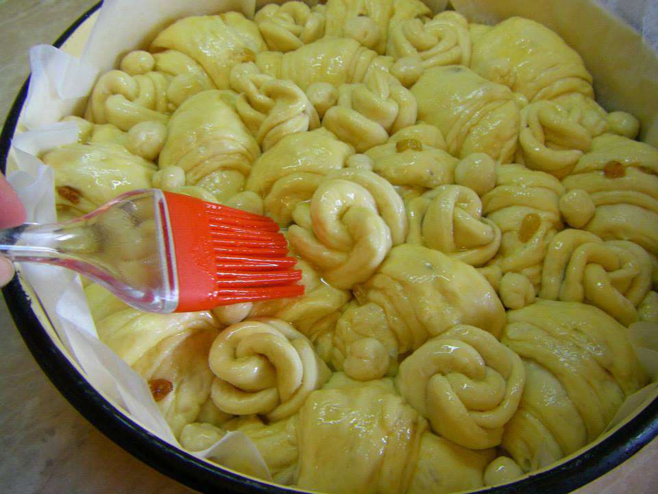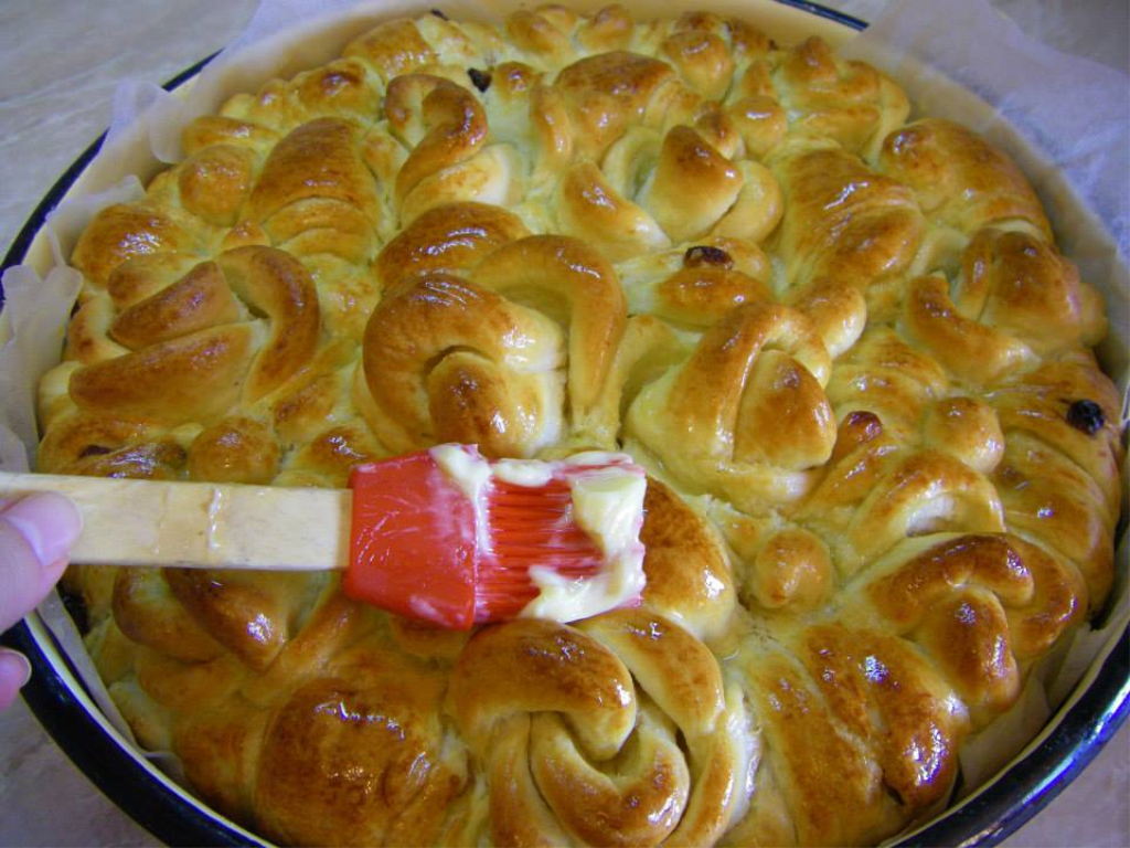 ВЕДНАГА СЛЕД КАТО СЕ ИЗВАДИ ОЩЕ ГОРЕЩА ОТ ФУРНАТА СЕ МАЖЕ С МЕКО МАСЛО
