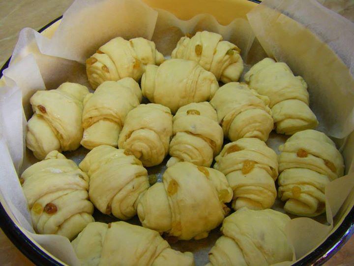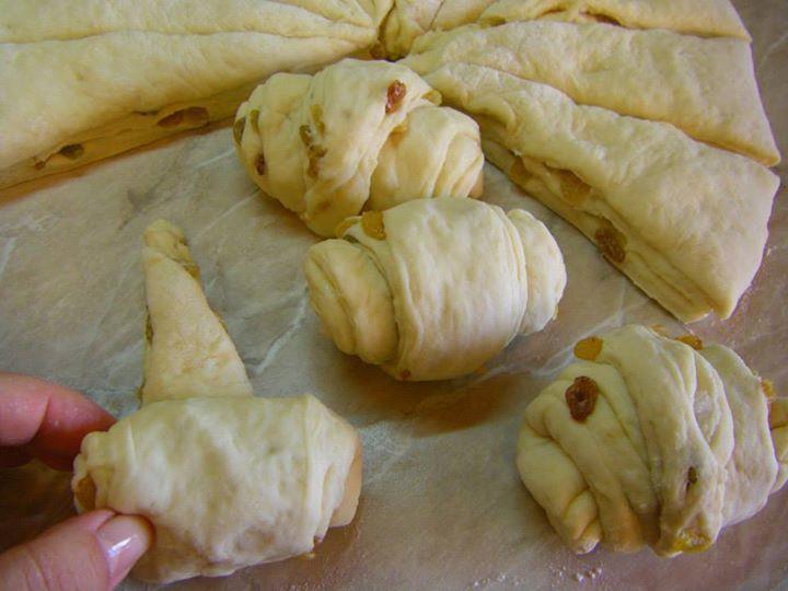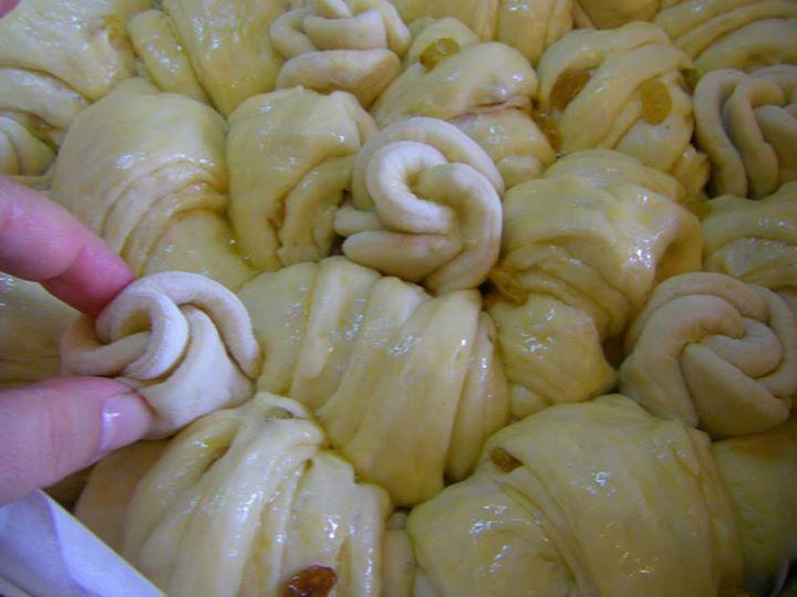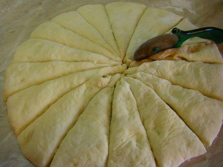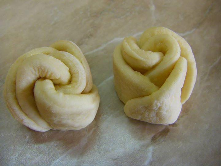 НАЧИН НА ПРИГОТВЯНЕ: В ХЛАДКОТО МЛЯКО СЕ РАЗТВАРЯ МАЯТА. ПРИБАВЯТ СЕ ЗАХАРТА, ЯЙЦАТА, ОЛИОТО, БРАШНОТО И СЕ ЗАМЕСВА ЕЛАСТИЧНО ТЕСТО, КОЕТО СЕ ОСТАВЯ ДА ВТАСА, ДОКАТО УДВОИ ОБЕМА СИ. РАЗДЕЛЕТЕ ТЕСТОТО НА ЧЕТИРИ РАВНИ ЧАСТИ, КАТО ВСЯКА ЧАСТ ИДВА С ТЕЖЕСТ ОТ 400 ГР. РАЗТОЧЕТЕ ТРИТЕ ЧАСТИ НА КРЪГОВЕ. НАМАЖЕТЕ ПЪРВИЯ КРЪГ С РАЗТОПЕНО МАСЛО И ПОРЪСЕТЕ С ПОЛОВИНАТА ЧАСТ ОТ СТАФИДИТЕ (КАКТО МОЖЕ ДА ВИДИТЕ ОТ СНИМКИТЕ "СТЪПКА ПО СТЪПКА") СЛОЖЕТЕ ОТГОРЕ ВТОРИЯ КРЪГ , НАМАЖЕТЕ ОТНОВО С РАЗТОПЕНО МАСЛО И ПОРЪСЕТЕ С ОСТАНАЛИТЕ СТАФИДИ. НАКРАЯ ПОКРИЙТЕ С ТРЕТИЯ КРЪГ. РАЗРЕЖЕТЕ ПО ДИАГОНАЛ НА 16 ТРИЪГЪЛНИКА. НАВИЙТЕ ТРИЪГЪЛНИЦИТЕ НА КИФЛИЧКИ. ПОДРЕДЕТЕ ГОТОВИТЕ КИФЛИЧКИ В ТАВА С ГОЛЕМИНА ОТ 32 СМ ПОКРИТА С ХАРТИЯ ЗА ПЕЧЕНЕ. ЧЕТВЪРТАТА ЧАСТ РАЗТОЧЕТЕ И С ПОМОЩТА НА ЧАШКА ИЗРЕЖЕТЕ КРЪГОВЕ. ПОДРЕДЕТЕ ПО ПЕТ КРЪГЧЕТА В КОЛОНКА, НАМАЖЕТЕ ГИ С РАЗТОПЕНО МАСЛО. НАВИЙТЕ ГИ. РАЗРЕЖЕТЕ ГИ С ПОМОЩТА НА НОЖ НА ДВЕ И ПО ТОЗИ НАЧИН ЩЕ ПОЛУЧИТЕ ДВЕ КРАСИВИ РОЗИ. НАПРАВЕТЕ ОЩЕ РОЗИ, КАТО БРОЯ Е ПО ВАШ ИЗБОР, СЛЕД КОЕТО ГИ ПОДРЕДЕТЕ МЕЖДУ КИФЛИЧКИТЕ. ОТ ИЗРЕЗКИТЕ НА ТЕСТОТО НАПРАВЕТЕ МАЛКИ ТОПЧЕНЦА И УКРАСЕТЕ С ТЯХ ПИТАТА, КАТО ГИ РАЗПРЕДЕЛИТЕ ПО РАВНО НАВСЯКЪДЕ. НАМАЖЕТЕ С РАЗБИТ ЖЪЛТЪК И ОСТАВЕТЕ ЗА ОКОЛО 30 МИНУТИ НА ТОПЛО ОТНОВО ДА ВТАСА ГОТОВАТА ПИТА. ПЕЧЕТЕ В УМЕРЕНА ФУРНА НА 180 ГРАДУСА ДО ЗЛАТИСТ ЦВЯТ. ВЕДНАГА СЛЕД КАТО СЕ ИЗВАДИ ОЩЕ ГОРЕЩА ОТ ФУРНАТА СЕ МАЖЕ С МЕКО МАСЛО, СЛЕД ТОВА С ПОМОЩТА НА ЛЪЖИЦА СЕ ЗАЛИВА ОБИЛНО С МЕД. СТАВА ГОЛЯМА ВКУСОТИЯ, ХЕМ ПУХКАВА ПИТА, ХЕМ АРОМАТНА С КОРИЧКА ОТ МАСЛО И МЕД. ПРОБВАЙТЕ И СПОДЕЛЕТЕ. ДА ВИ Е СЛАДКО.