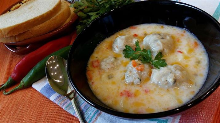 Каймата се омесва с подправките и предварително измития ориз и се оформят топчета, които овалваме в брашно. За размера всичко е въпрос на вкус, в моя случай са по големички и са точно както ги предпочитаме. Праз лука, чушката и моркова, нарязваме на ситно, задушаваме в олиото на умерена температура. Моркова отпуска цвят и супата става по-жълта. Когато зеленчуците в тенджерата са поомекнали, добавяме вода. Пускаме топчетата в кипящата смес. Оставяме топчетата да поврат петнадесетина минути, след което добавяме нарязаните на кубчета картофи, и след като картофите са почти готови прибавяме фидето. Оставяме супата да къкри още 7-8 минути. Приготвяме застройката. В малка тенджерка слагаме жълтъка, прибавяме брашното и млякото. Разбъркваме хубаво и слагаме тенджерката на котлона,като не спираме да бъркаме. Бърка се до сгъстяване(заприличва на крем) и започваме да добавяме бульона от супата с непрекъснато бъркане. Щом стане хомогенна смес прибавяме към останалата част от супата. Това е така наречената калена застройка. Поръсваме супата с магданоз и сервираме. Пробвайте и споделете. Да ви е сладко.
