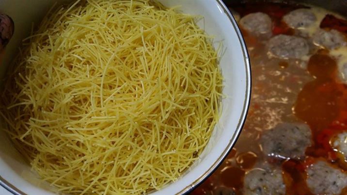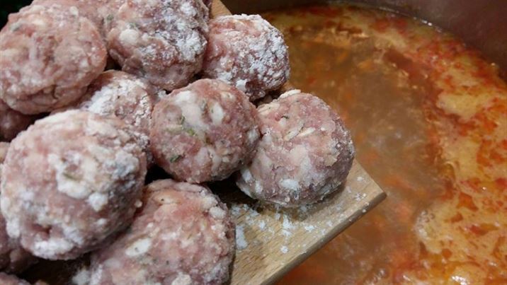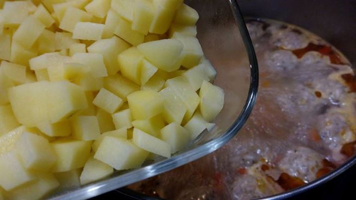 Когато зеленчуците в тенджерата са поомекнали, добавяме вода. Пускаме топчетата в кипящата смес. Оставяме топчетата да поврат петнадесетина минути