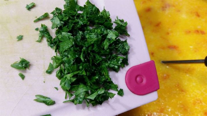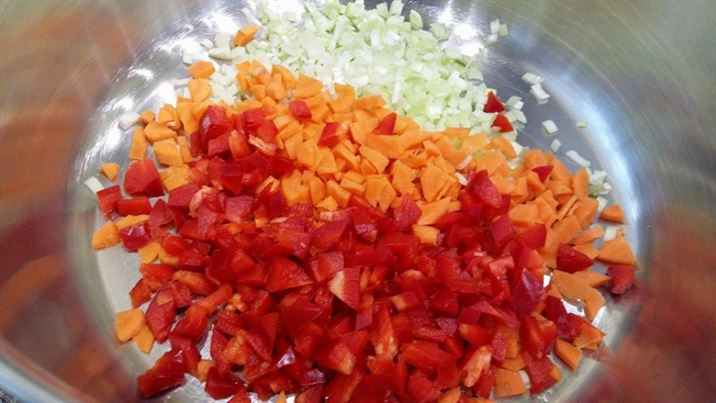 Праз лука, чушката и моркова, нарязваме на ситно, задушаваме в олиото на умерена температура
