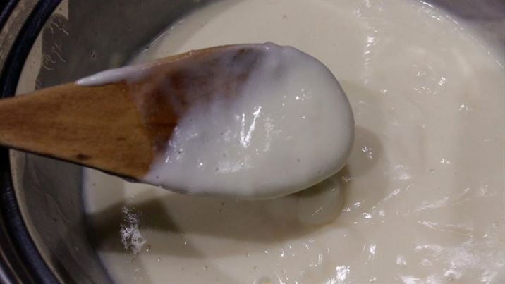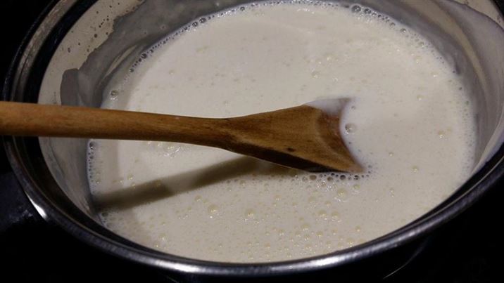 Разбъркваме хубаво и слагаме тенджерката на котлона,като не спираме да бъркаме. Бърка се до сгъстяване(заприличва на крем)