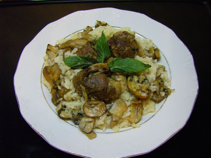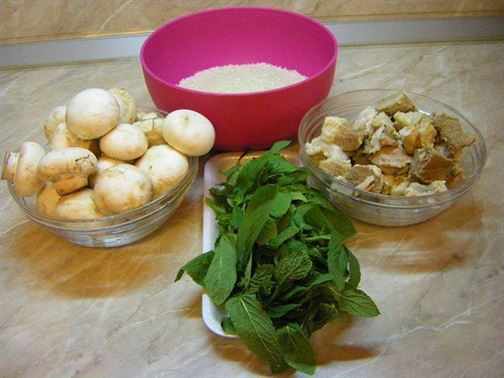 ОКОЛО 500 ГР СВИНСКО МЕСО,1 ВРЪЗКА ПРЕСЕН ДЖОДЖЕН,ОКОЛО 350-400 ГР ГЪБИ,2 ЧАЕНИ ЧАШИ ОРИЗ,СОЛ НА ВКУС,ОКОЛО 100 МЛ ОЛИО.