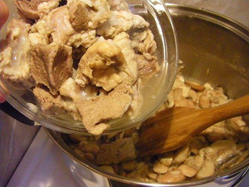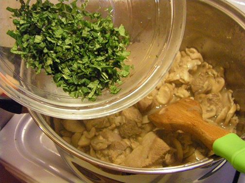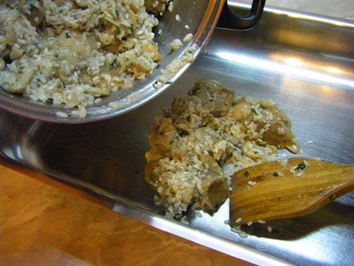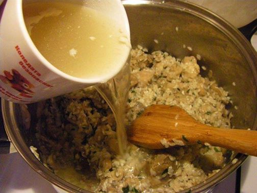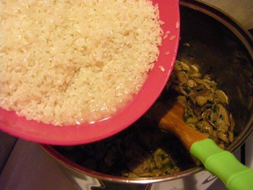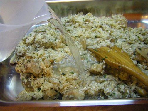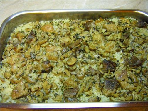 НАРЯЗВАТЕ НА ПАРЧЕТА МЕСОТО И ГО СВАРЯВАТЕ ЗА ОКОЛО 30 МИНУТИ.ОЦЕДЕТЕ ГО И ЗАПАЗЕТЕ БУЛЬОНА.В ТЕНДЖЕРА СЛОЖЕТЕ НАРЯЗАНИТЕ НА ЕДРИ ШАЙБИ ГЪБИТЕ И ГИ ЗАДУШЕТЕ В ОЛИОТО,ДОБАВЕТЕ МЕСОТО ДА СЕ ЗАПЪРЖИ ЛЕКО С ГЪБИТЕ И ПРИБАВЕТЕ ИЗМИТИЯ И СИТНО НАРЯЗАН ДЖОДЖЕН.СЛЕД ТОВА ПРИБАВЕТЕ ИЗМИТИЯ И ПОЧИСТЕН ОРИЗ ДА СЕ ПОЗАПЪРЖИ ДОКАТО ДОБИЕ СТЪКЛЕН ЦВЯТ.КЪМ ЯСТИЕТО ИЗСИПЕТЕ 300 МЛ ТОПЪЛ БУЛЬОН ОТ ТОЗИ В КОИТО СТЕ ВАРИЛИ МЕСОТО,ПОСОЛЕТЕ НА ВКУС.СЛЕД КАТО ОРИЗА ПОЕМЕ ГОЛЯМА ЧАСТ ОТ БУЛЬОНА (КАКТО МОЖЕ ДА ВИДИТЕ ОТ СНИМКИТЕ "СТЪПКА ПО СТЪПКА") ИЗСИПЕТЕ В ТАВА ,ЗАЛЕЙТЕ С 1 ЛИТЪР И 1ОО МЛ БУЛЬОН (АКО НЯМАТЕ ДОСТАТЪЧНО БУЛЬОН ДОПЪЛНЕТЕ С ВОДА).ЗАПЕЧЕТЕ ЯСТИЕТО НА УМЕРЕНА ФУРНА ДОКАТО ОСТАНЕ НА МАЗНИНА.