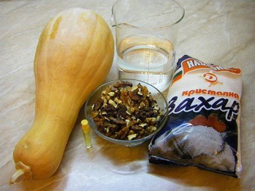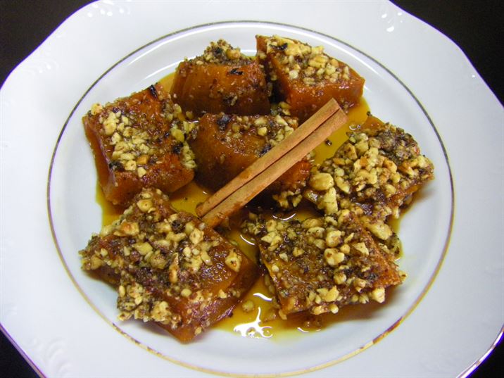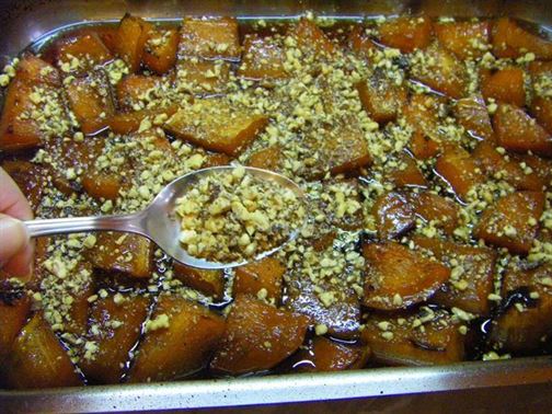 Докато тиквата е още гореща, поръсете с едро нарязани печени орехи.