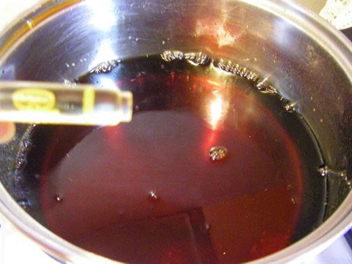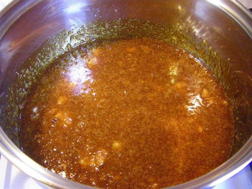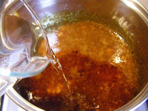В подходяща тенджера карамелизирайте захарта на котлона. Добавете внимателно 350 мл гореща вода и ванилията. Бъркайте непрекъснато, докато карамелът напълно се разтвори. Оставете сместа да ври на умерена температура за 10–15 минути, докато се получи гъст ароматен сироп.