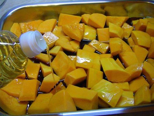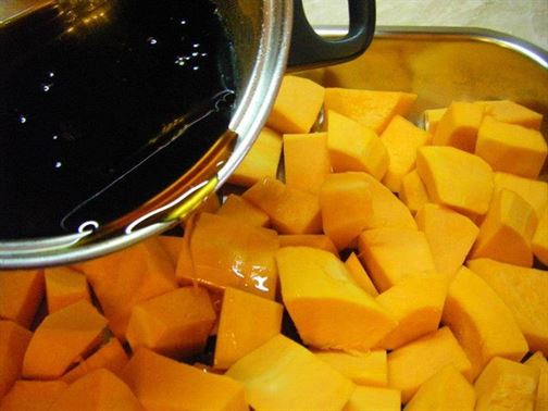 Нарежете почистената тиква на кубчета и я подредете в подходяща тава. Залейте с карамеления сироп, поръсете с олиото и печете в предварително загрята фурна на 200°C около 30 минути.