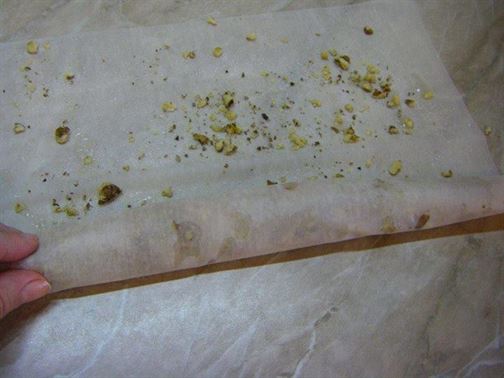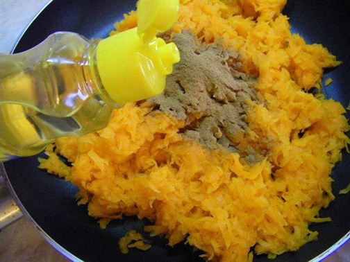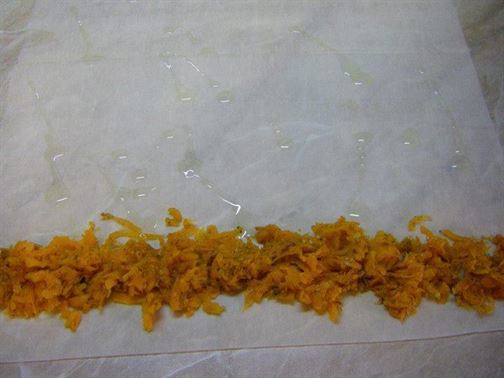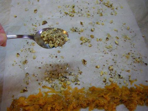 Сложете лента от тиквената плънка в началото на кората, поръсете леко с олио.