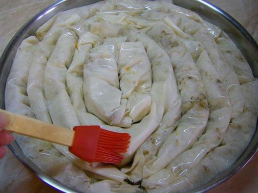 Подредете рулата в намаслена тава и накрая поръсете тиквеника с още малко олио.
