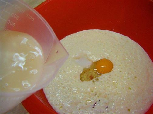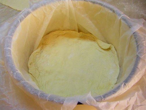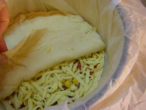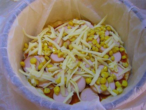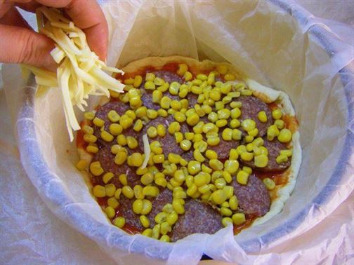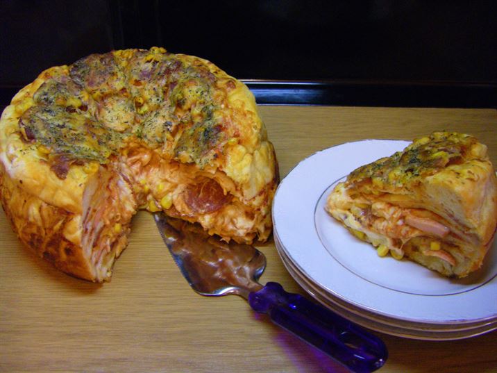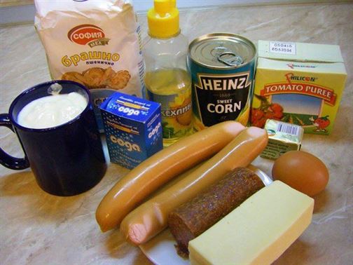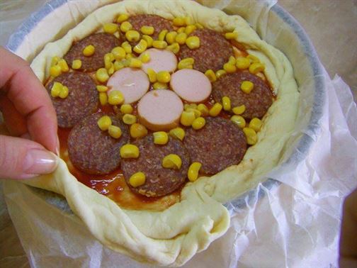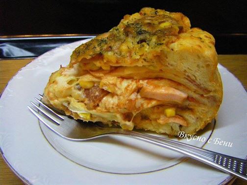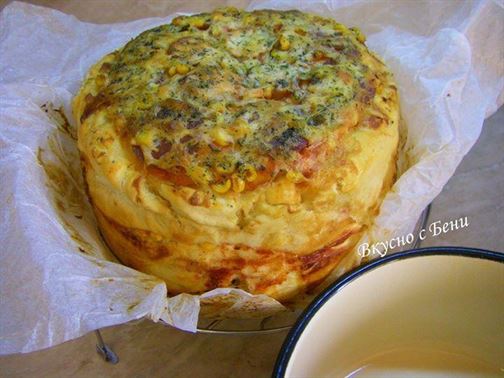 Разтворете маята с 2 супени лъжици брашно и захарта в 0, 500 мл хладката вода, покрийте и оставете да втаса за 15 минути. В киселото мляко разбъркайте содата бикарбонат и изсипете в голяма купа. Прибавете яйцето и солта, а след това и 3-4 супени лъжици олиото, втасалата мая и разбъркайте. Постепенно прибавяйте пресятото брашно и бъркайте. Когато тестото започне да се отделя от стените на купата, извадете го върху набрашнена повърхност и омесете прибавяйки по малко брашно. Тестото трябва да е меко за да стане пухкава и мека пицата торта. Намажете с мазнина голяма купа и тестото, покрийте ги с кърпа и оставете на топло да втаса до удвояване на обема. Изсипете втасалото тесто върху работния плот, откъснете горе-долу пет равни части , като всяка тежи около 150 грама, а от останалото тесто, което със сигурност ще ви остане оформете два хляба, с който ще очаровате домашните . Всяка част разточете с големината на тенджерата в която ще печете пицата-торта (в случая 28 см) застилате с хартия за печене (хартията спомага след изпичането по-лесно да махнете пицата-торта от тенджерата без да нарушите формата). Нарежете на кръгчета салама и кренвиршите, а кашкавала настържете на едро. Започнете да редите като покривате дъното с блат, след това го намажете с доматено пюре, подредете салама, поръсете с царевица и настърган кашкавал. Покрийте с блат и по същия начин намажете с доматено пюре, като на този сложете кръгчета от кренвирши, след това всичко останало. Редите така всеки следващ блат, като последния разточете по голям, за да може след като подредите колбаса и наръсите с царевица и кашкавал да оформите борд за ефектна горна част на тортата-пица. Както може да видите запълването е почти максимално на тенджерата без 3-4 см. Сложете без да чакате да втасва в умерена фурна на 180 градуса да се пече за около 45-50 минути до златист цвят. Извадете веднага след опичането на решетка да се охлади за малко. След това нарежете и сервирайте. ПРОБВАЙТЕ И СПОДЕЛЕТЕ. ДА ВИЕ СЛАДКО