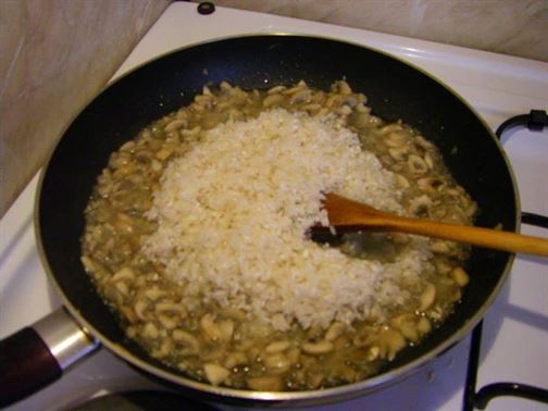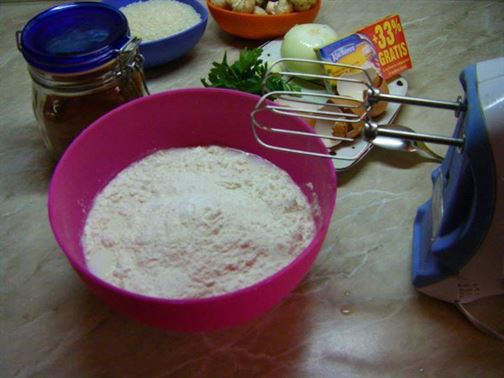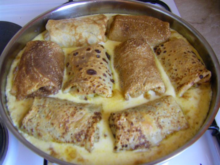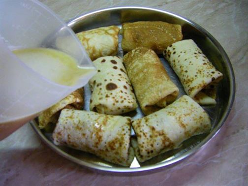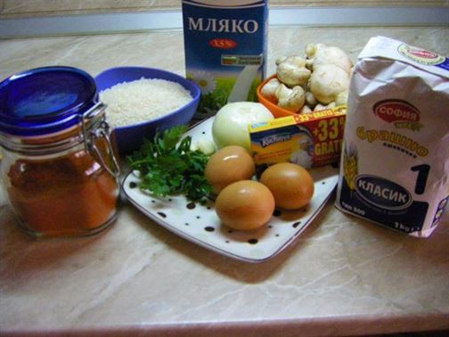 ЗА ПАЛАЧИНКИТЕ: 3 ЯЙЦА,1 1/2 Ч.ЧАША ПРЯСНО МЛЯКО,1 ЩИПКА СОДА БИКАРБОНАТ,200 ГР.БРАШНО, ЗА ПЪЛНЕЖА: 1/2 Ч.ЧАША ОЛИО,250-300 ГР.ГЪБИ,1-2 ГЛАВИ ЛУК,2 СКИЛИДКИ ЧЕСЪН,1 Ч.ЧАША ОРИЗ,СОЛ НА ВКУС, 1 Ч.ЛЪЖ.ЧЕРВЕН ПИПЕР,1/2 ВРЪЗКА КОПЪР(МОЖЕ И ПО МАЛКО),1/2 МАГДАНОЗ,1 КУБЧЕ ГЪБЕН БУЛЪОН (РАЗТВОРЕН В 250 МЛ ТОПЛА ВОДА),1 СУП.ЛЪЖ.МАСЛО. ЗА ЗАЛИВКАТА:2 ЯЙЦА,1 Ч.ЧАША ПРЯСНО МЛЯКО