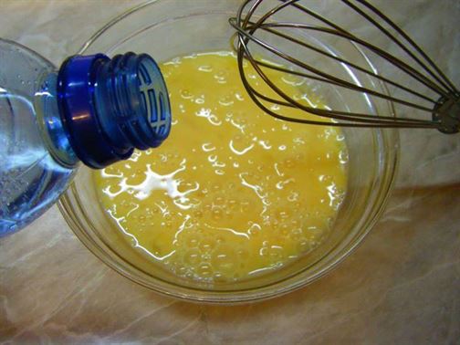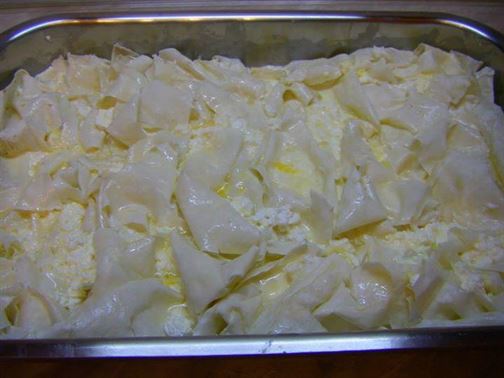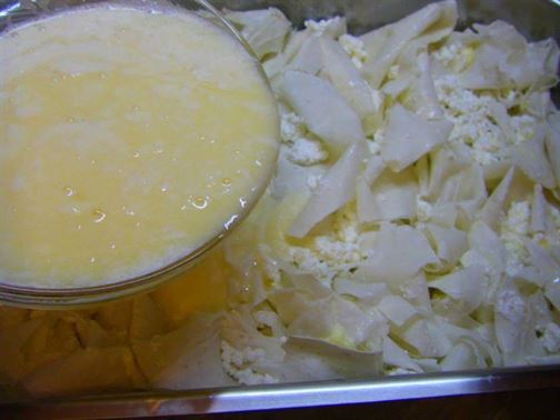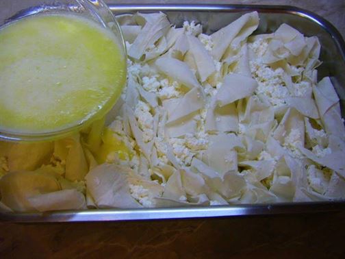 Започнете да редите корите,като преди това сте намазали с малко олио тавата,сложете три броя като ги нагъвате. Поръсете със натрошено сирене.Сложете останалите две кори пак нагънете и наръсете сирене.Смесете разтопеното масло и олиото.Смесете мазнината с половината газирана вода (както може да видите от снимките "стъпка по стъпка") Полейте баница и разклатете тавата за да отиде между корите. Разбийте яйцата и прибавете другата половинка газирана вода и полейте с тази смес отгоре и разклатете отново.Печете баницата в умерена фурна на 180-200 градуса до златист цвят. ИДЕЯТА С МАЛКО ПРОМЕНИ ОТ МОЯ СТРАНА Е ОТ НЕТА. ПРОБВАЙТЕ И СПОДЕЛЕТЕ. ДА ВИ Е СЛАДКО.