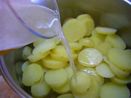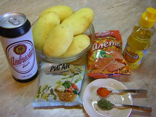 6-7 СРЕДНО ГОЛЕМИ КАРТОФА, 100 МЛ ОЛИО, 500 МЛ БИРА, 1/2 ЧАЕНА ЛЪЖИЦА ЧЕРВЕН ПИПЕР, 1/2 ЧАЕНА ЛЪЖИЦА ЧУБРИЦА, 1/2 ЧАЕНА ЛЪЖИЦА РИГАН, 1 СУПЕНА ЛЪЖИЦА ГАЛЕТА.