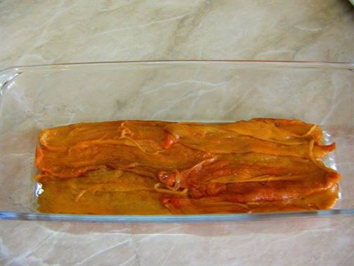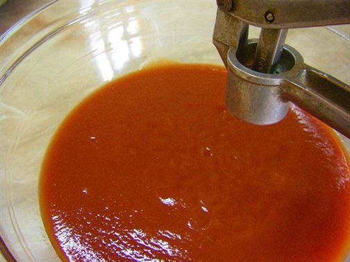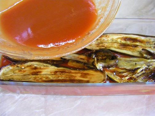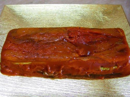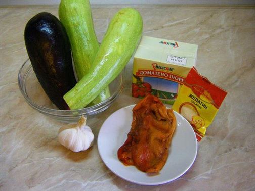 500 МЛ ДОМАТЕНО ПЮРЕ,1 СРЕДНО ГОЛЯМ ПАТЛАДЖАН,2 СРЕДНО ГОЛЕМИ ТИКВИЧКИ,2-3 ПЕЧЕНИ ЧУШКИ,3-4 СУПЕНИ ЛЪЖИЦИ ОЛИО,15 ГР ЖЕЛАТИН,1-2 СКИЛИДКИ ЧЕСЪН,СОЛ НА ВКУС.