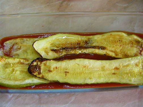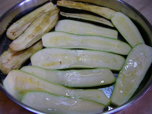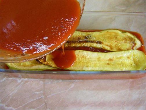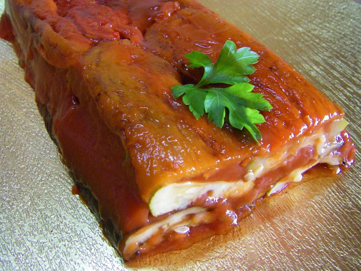 НАРЕЖЕТЕ ПАТЛАДЖАНИТЕ И ТИКВИЧКИТЕ НА ДЕБЕЛИ ПАРЧЕТА ПО ДЪЛЖИНА.ПОРЪСЕТЕ ПАТЛАДЖАНА СЪС СОЛ И ОСТАВЕТЕ ДА ПРЕСТОИ ЗА 10-15 МИНУТИ,ЗА ДА ПУСНЕ ГОРЧИВИЯ СИ СОК.ИЗМИЙТЕ ГО И ЗАЕДНО С ТИКВИЧКИТЕ,ГИ ПОДРЕДЕТЕ В ПОДХОДЯЩА ТАВА,КОЯТО СТЕ НАМАЗАЛИ С ОЛИОТО.ПОРЪСЕТЕ ГИ СЪС СОЛ НА ВКУС И ГИ ПЕЧЕТЕ ВЪВ ФУРНАТА ПРИ 200 ГРАДУСА,ДОКАТО ОМЕКНАТ НА ПЪЛНО.РАЗТОПЕТЕ НА ВОДНА БАНЯ ЖЕЛАТИНА,ЗАЛЯТ С 60 МЛ ВОДА.ДОБАВЕТЕ КЪМ ДОМАТЕНОТО ПЮРЕ СКИЛИДКИТЕ ЧЕСЪН,КАТО ГИ ПРЕСОВАТЕ,ДОБАВЕТЕ СОЛ НА ВКУС И ВНИМАТЕЛНО ПРИБАВЕТЕ ЖЕЛАТИНА (КАКТО МОЖЕ ДА ВИДИТЕ ОТ СНИМКИТЕ "СТЪПКА ПО СТЪПКА").НА ДЪНОТО НА ПРОДЪЛГОВАТА ФОРМА,КОЯТО СТЕ НАМАЗАЛИ С МАЛКО МАЗНИНА ПРЕДВАРИТЕЛНО ,НАРЕДЕТЕ ПЕЧЕНИТЕ ЧУШКИ,ЗАЛЕЙТЕ ГИ С ДОМАТЕНО ПЮРЕ,А ОТГОРЕ НАРЕДЕТЕ ПЛАСТ ТИКВИЧКИ,ЗАЛЕЙТЕ ГИ С ДОМАТЕНО ПЮРЕ,ПАТЛАДЖАНИ И РЕДУВАЙТЕ ТАКА ДО КРАЯ.ПОСТАВЕТЕ В ХЛАДИЛНИК И ОСТАВЕТЕ ДА ПРЕСТОИ ЗА НЯКОЛКО ЧАСА ДА СЕ ЖЕЛИРА НАПЪЛНО,АКО ИСКАТЕ ПО-БЪРЗО СЛОЖЕТЕ ГО ВЪВ ФРИЗЕРА ЗА 1 ЧАС И 30 МИНУТИ.В ПОДХОДЯЩА ЧИНИЯ ОБЪРНЕТЕ И УКРАСЕТЕ С МАГДАНОЗ. ПРОБВАЙТЕ И СПОДЕЛЕТЕ. ДА ВИ Е СЛАДКО.