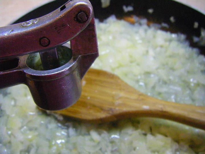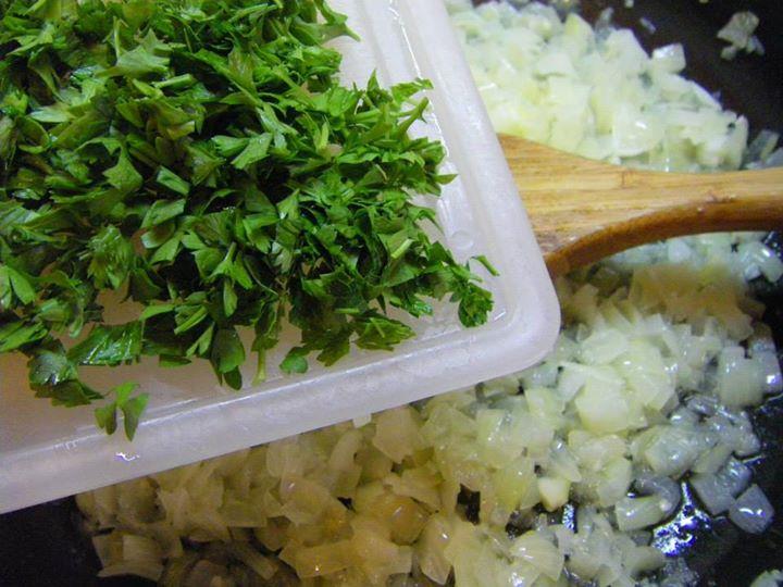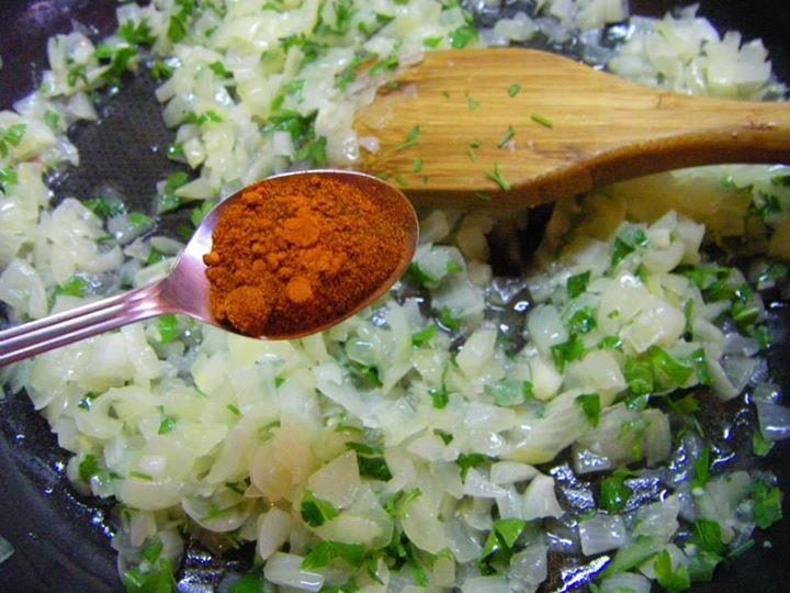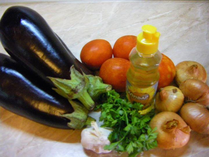 4 СРЕДНО ГОЛЕМИ ПАТЛАДЖАНА, 4 ГЛАВИ КРОМИД ЛУК, 4-5 СКИЛИДКИ ЧЕСЪН, 4-5 СТРЪКА МАГДАНОЗ, 1 ЧАЕНА ЛЪЖИЦА ЧЕРВЕН ПИПЕР, 3-4 ДОМАТА, ОЛИО ЗА ПЪРЖЕНЕ