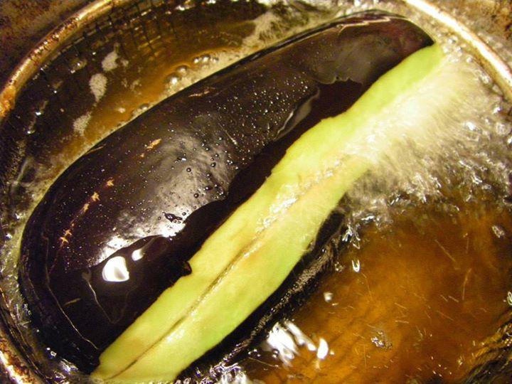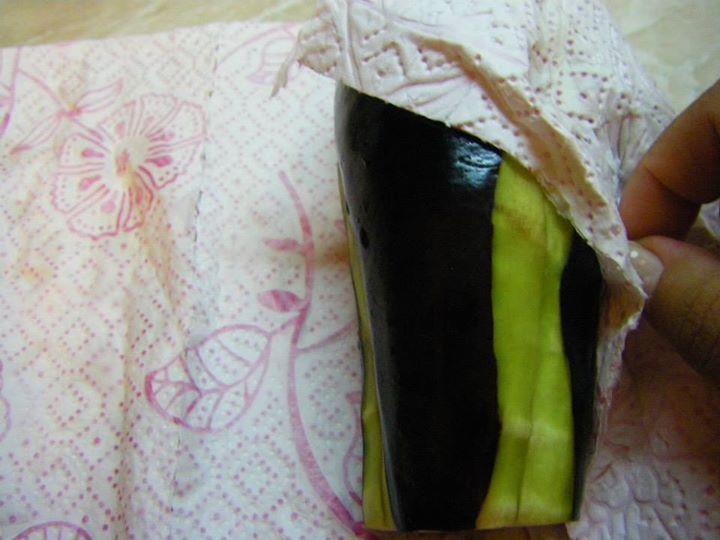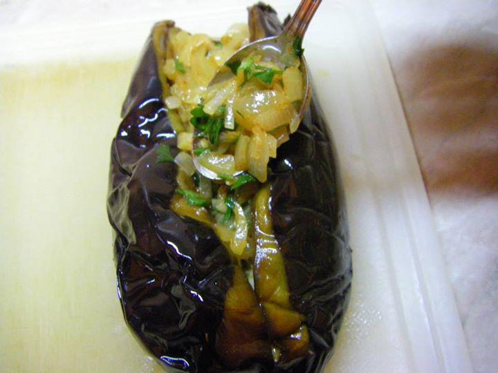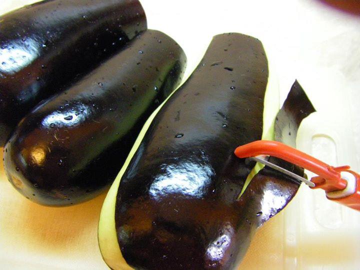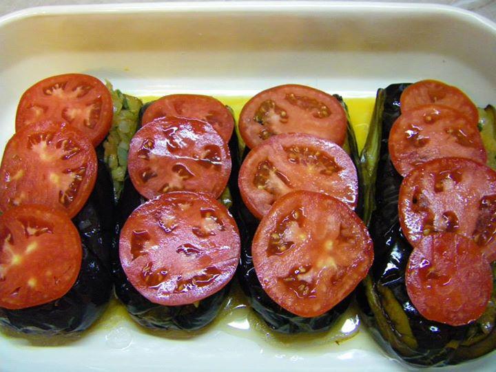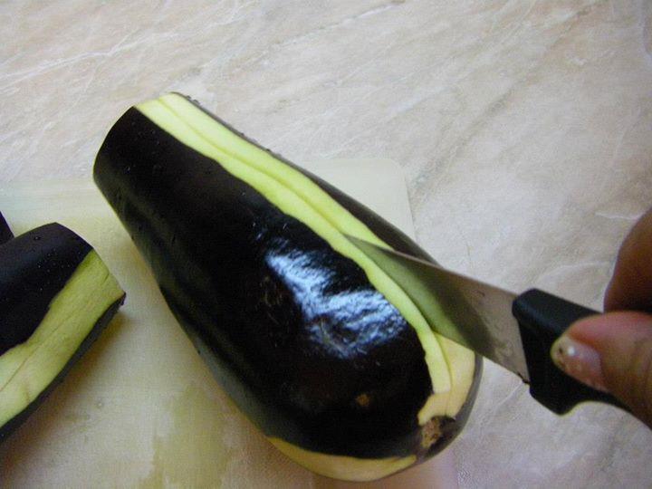 ПАТЛАДЖАНИТЕ СЕ ИЗМИВАТ И ДРЪЖКИТЕ ИМ СЕ ОТРЯЗВАТ. НА ТРИ МЕСТА ПО ДЪЛЖИНА ОТ КОРАТА ИМ СЕ ОБЕЛВА ПО ЕДНА ЛЕНТА И НА ТОВА МЯСТО СЕ ПРАВЯТ ДЪЛБОКИ НАРЕЗИ С НОЖ (КАКТО МОЖЕ ДА ВИДИТЕ ОТ СНИМКИТЕ "СТЪПКА ПО СТЪПКА") В ТЯХ СЕ ПОРЪСВА СОЛ И ПАТЛАДЖАНИТЕ ПРЕСТОЯВАТ ТАКА ОКОЛО 45-50 МИНУТИ. ИЗСТИСКВАТ СЕ, ОЦЕЖДАТ СЕ, ПОДСУШАВАТ СЕ И СЕ СЛАГАТ ДА СЕ ПЪРЖАТ В ГОРЕЩО ОЛИО. ИЗВАЖДАТ СЕ И СЕ ОСТАВЯТ МАЛКО ДА СЕ ОХЛАДЯТ. ПРЕЗ ТОВА ВРЕМЕ В ПОДХОДЯЩ ТИГАН С МАЛКО ОЛИО СЕ ЗАПЪРЖВА ОБЕЛЕНИЯ И СИТНО НАРЯЗАН КРОМИД И ПРЕСОВАН ЧЕСЪН, ЩОМ ЛУКА ОМЕКНЕ НАПЪЛНО, СЕ ПОРЪСВА СЪС СОЛ И СЕ ПРИБАВЯ НАРЯЗАНИЯ МАГДАНОЗ И ЧЕРВЕН ПИПЕР. С ТАЗИ СМЕС СЕ ЗАПЪЛВАТ НАРЕЗИТЕ В ПАТЛАДЖАНИТЕ, КОИТО СЕ НАРЕЖДАТ В НАМАЗАНА С ОЛИО ТАВИЧКА. ДОМАТИТЕ СЕ НАРЯЗВАТ НА ДЕБЕЛИ ШАЙБИ И С ТЯХ СЕ ПОКРИВАТ ПАТЛАДЖАНИТЕ. ЯСТИЕТО СЕ ПЕЧЕ В УМЕРЕНА ФУРНА, ДОКАТО ОСТАНЕ НА МАЗНИНА. ПОДНАСЯ СЕ ОХЛАДЕНО. ЯСТИЕ С НЕВЕРОЯТЕН ВКУС И АРОМАТ ПРОБВАЙТЕ И СПОДЕЛЕТЕ. ДА ВИ Е СЛАДКО.